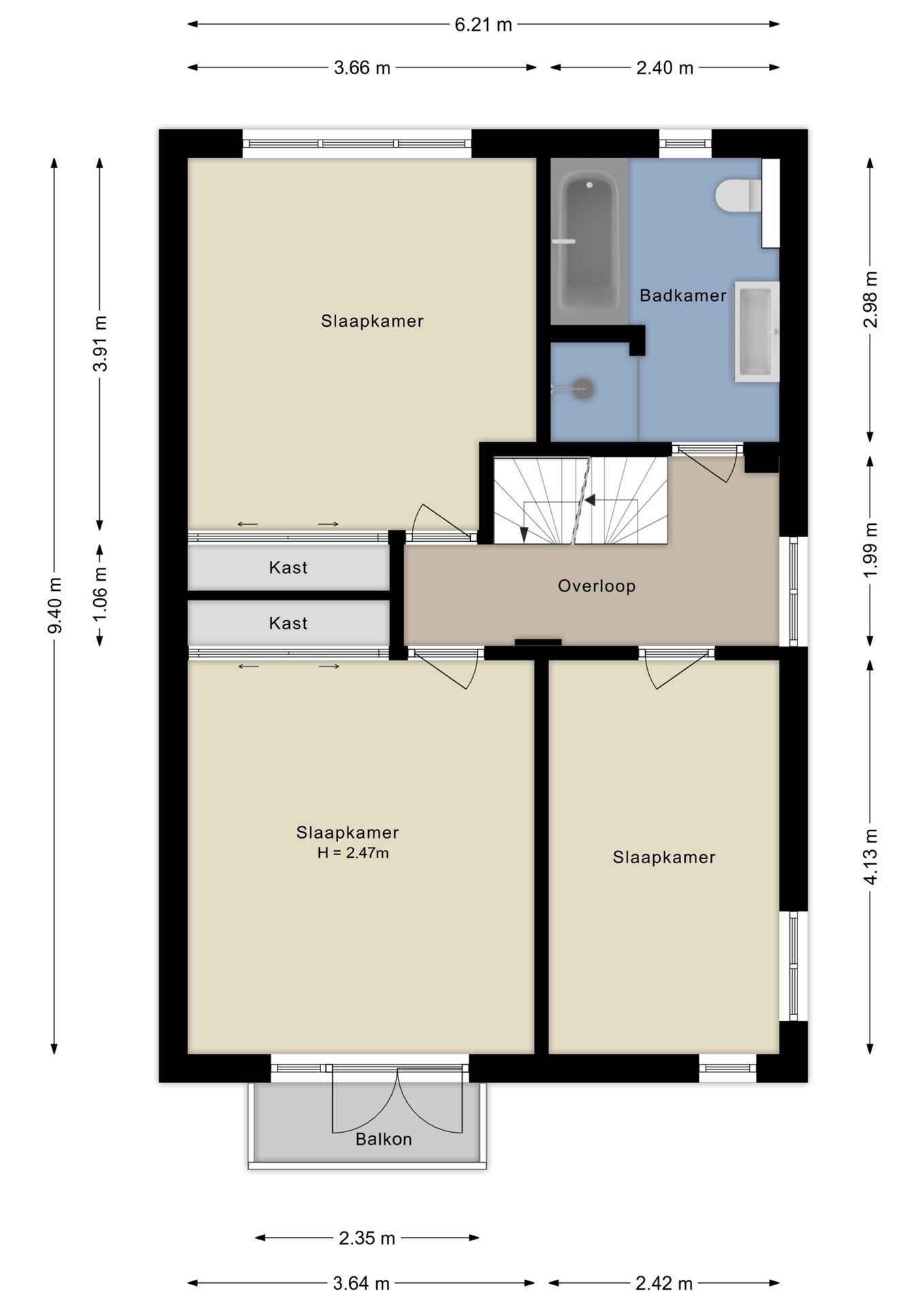 De overloop met veel daglicht geeft toegang tot drie ruime slaapkamers, allen voorzien van een nette laminaatvloer. De ouderslaapkamer beschikt daarnaast over een balkon, inbouwkast en airconditioning. De moderne badkamer is uitgerust met een ligbad, douche, wastafelmeubel en vloerverwarming.
