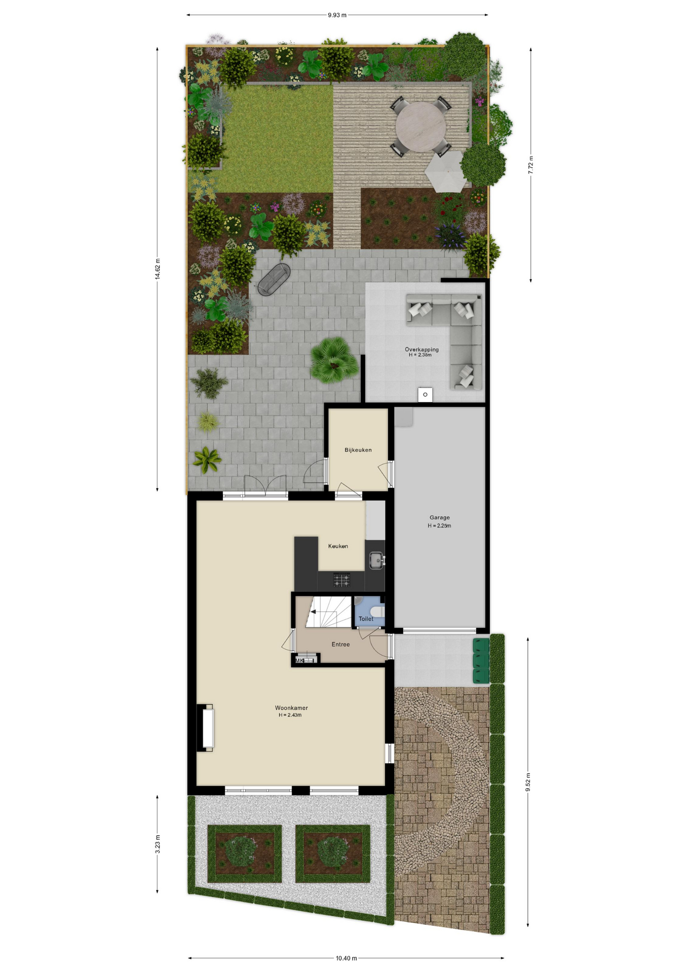 - Garage met oprit voor meerdere auto’s.