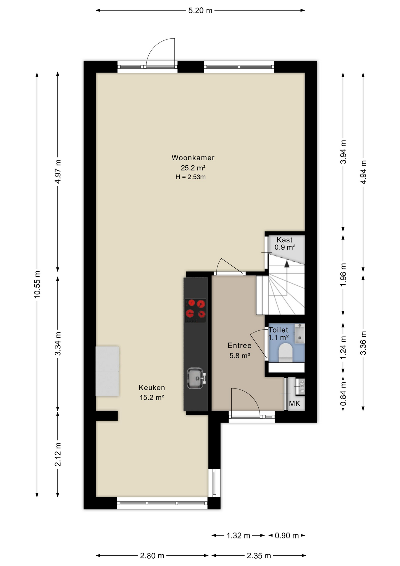 De hal/entree biedt toegang tot de ruime woonkamer, het toilet, de meterkast en trapopgang naar de eerste verdieping. De woonkamer is ca. 25 m² groot en voorzien van een trapkast en een open inbouwkeuken met diverse apparatuur. Aansluitend bevindt zich de royale achtertuin op het oosten met achterom.