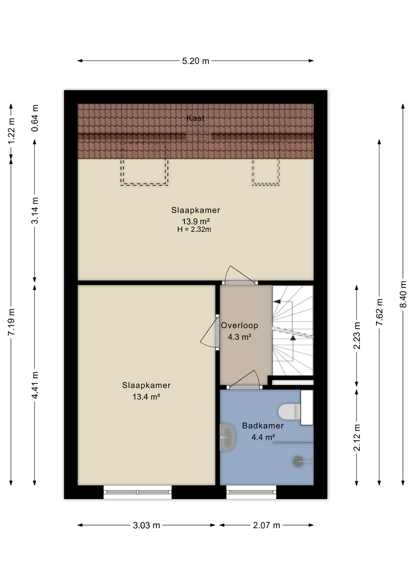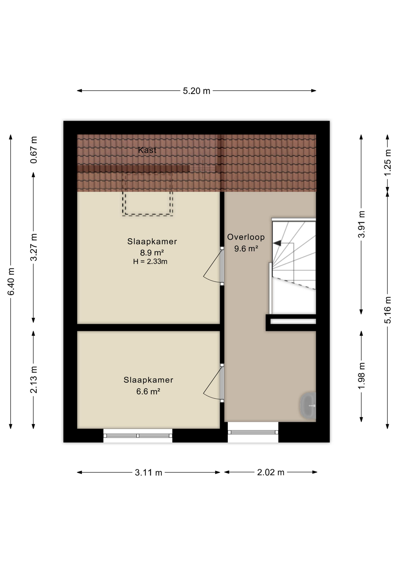 De overloop biedt toegang tot een tweetal goed bemeten slaapkamers, alsmede de moderne badkamer met douche, toilet en wastafel.