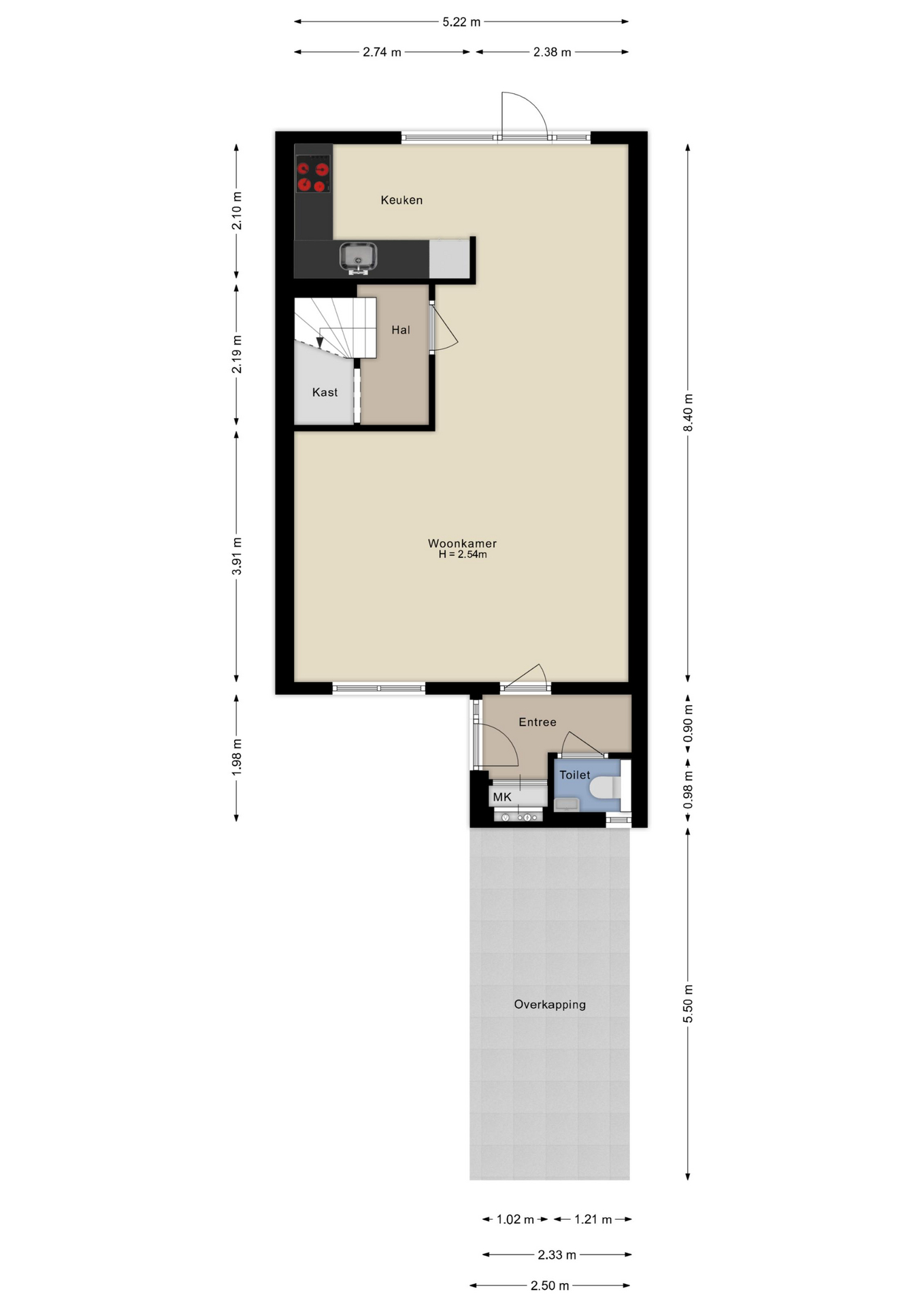 De hal/entree biedt toegang tot de ruime woonkamer, het toilet en de meterkast. De woonkamer is ca. 35 m² groot en voorzien van een nette open inbouwkeuken met diverse apparatuur en biedt toegang tot de tussenhal met trapkast en trapopgang naar de eerste verdieping