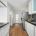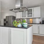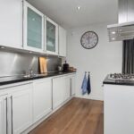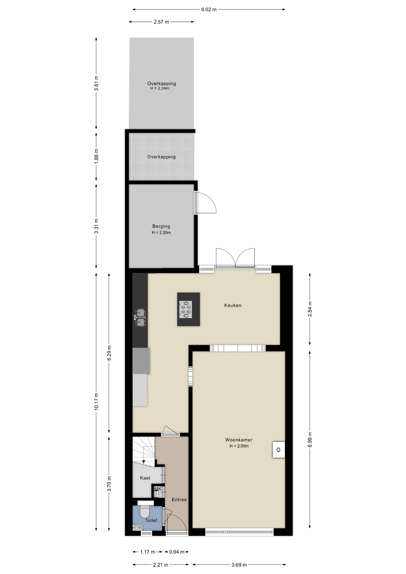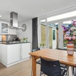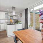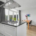 Je betreedt de woning via de hal met meterkast, modern zwevend toilet met fontein en een praktische bergkast onder de trap. Via een glazen deur kom je in de royale, uitgebouwde woon-/eetkeuken met kookeiland, natuurstenen werkblad en diverse inbouwapparatuur, waaronder een oven, magnetron, vaatwasser, 5-pits gaskookplaat en afzuigkap. De opstelling biedt volop werk- en bergruimte en is een fijne plek om te koken en samen te komen. Een lichtkoepel zorgt voor extra daglicht en speelse doorkijkjes verbinden de keuken met de woonkamer. De eetkamer biedt plek voor een grote tafel en via de openslaande deuren loop je zo de zonnige achtertuin op het zuidwesten in.