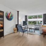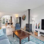 De woonkamer aan de voorzijde is ruim en sfeervol, met een massief eikenhouten vloer en een houtkachel die direct warmte en gezelligheid geeft.