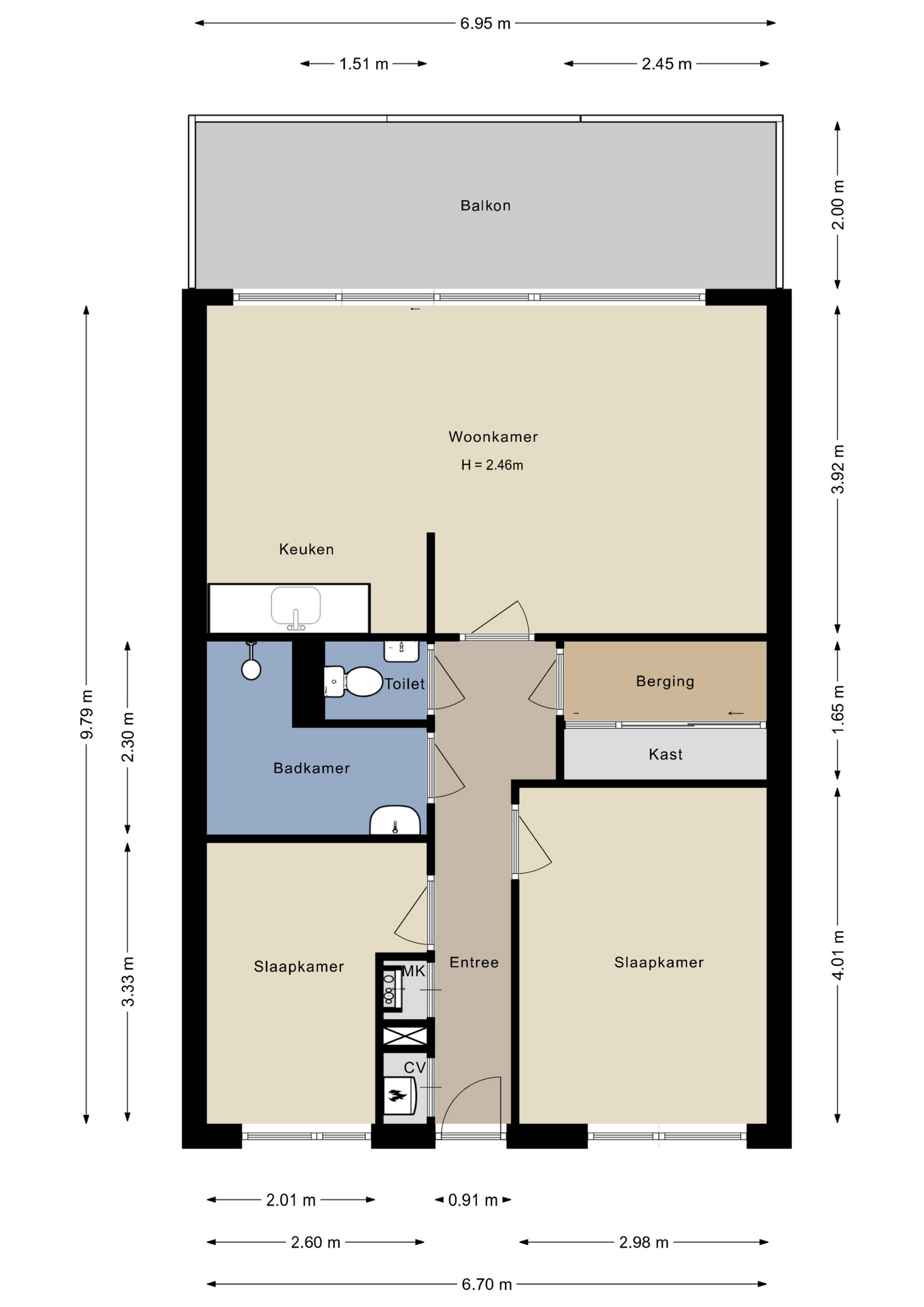 Entree, hal met toegang tot 2 slaapkamers, berging. Separaat toilet. Badkamer met wastafel, douche en aansluiting voor het witgoed.