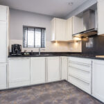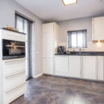 Entrance hall with meter cupboard, modern toilet with wall-hung toilet and washbasin, staircase with convenient storage space, and access to the living room and kitchen-diner. At the front of the house is the neat, fully equipped kitchen with a composite worktop and various built-in appliances. From the kitchen there is access to the front garden, and ample space for a large dining table.