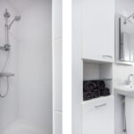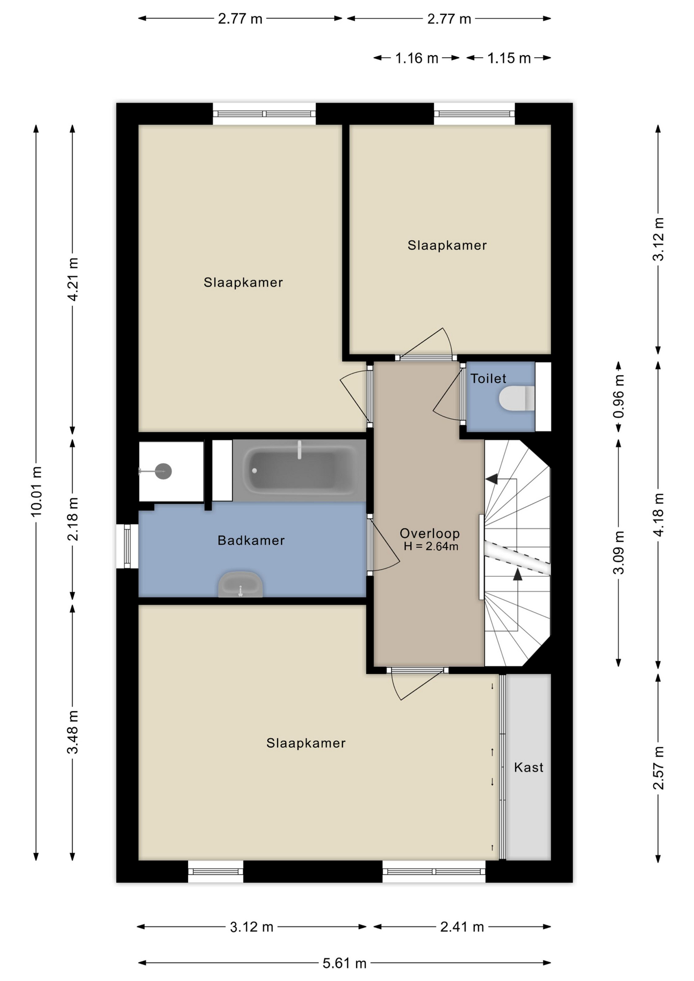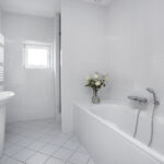 Spacious landing with access to three comfortable bedrooms. The modern bathroom is fitted with a walk-in shower, bathtub, and a wide washbasin. There is also a separate toilet with wall-hung toilet on this floor.