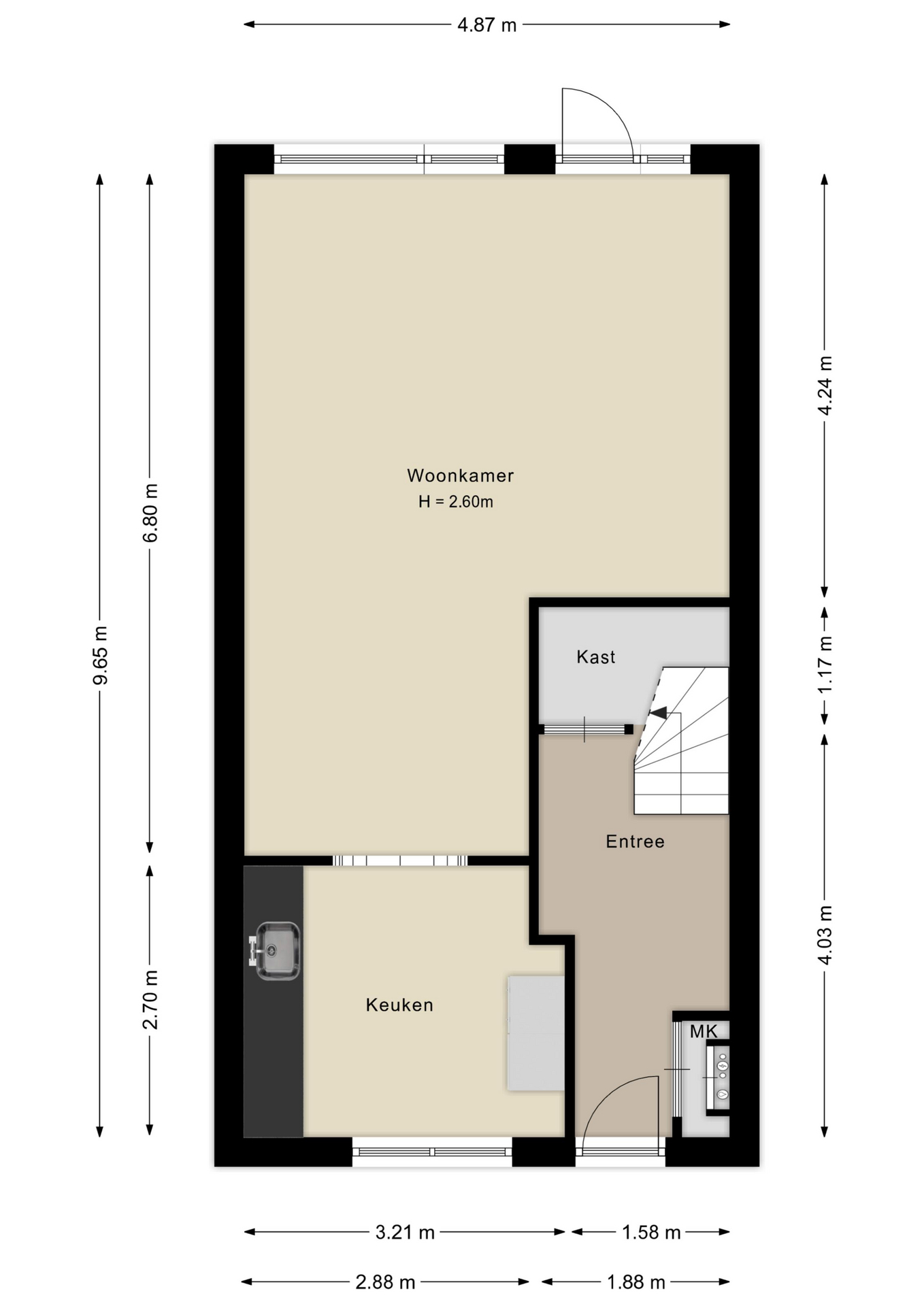 De hal/entree biedt toegang tot de ruime woonkamer, het toilet en de meterkast. De woonkamer is ca. 25m² groot en voorzien van een trapkast. Aansluitend bevindt zich de moderne inbouwkeuken, die is voorzien van diverse inbouwapparatuur. Aansluitend bevindt zich de royale achtertuin op het westen, gelegen aan het water.