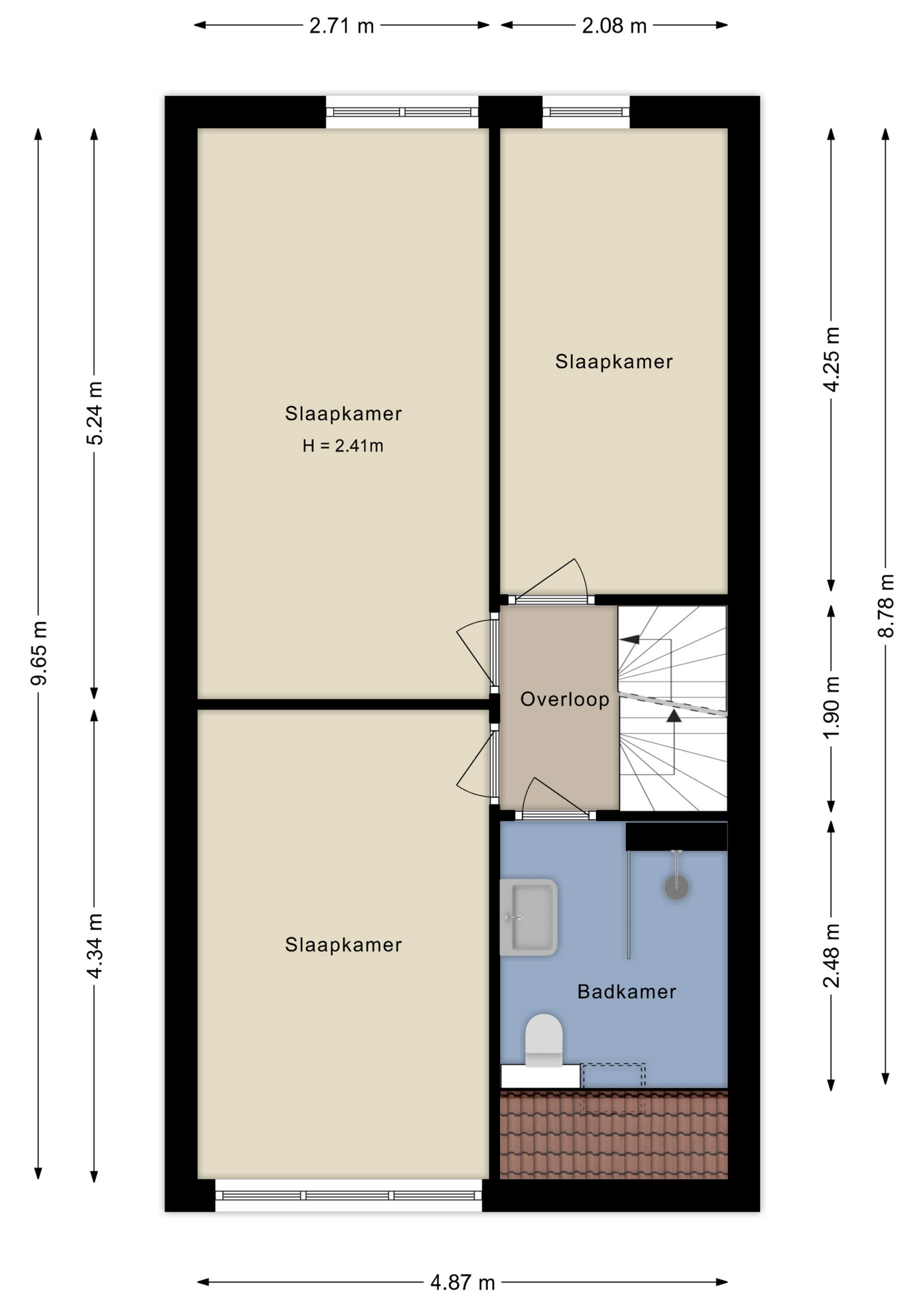 De overloop biedt toegang tot een drietal goed bemeten slaapkamers, alsmede de badkamer met douche, toilet en wastafel.