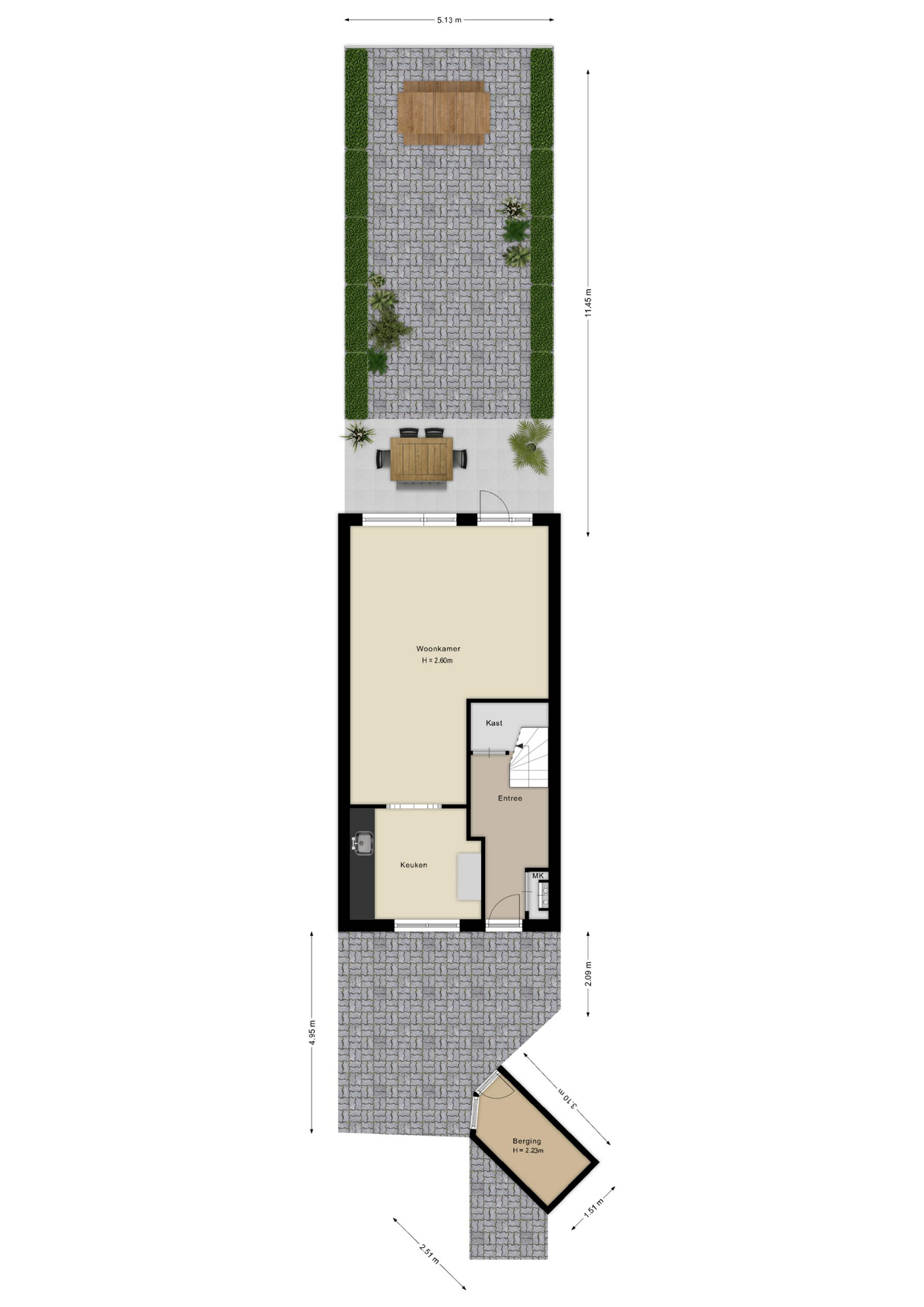 De voortuin is eveneens netjes ingericht en biedt toegang tot de stenen berging.