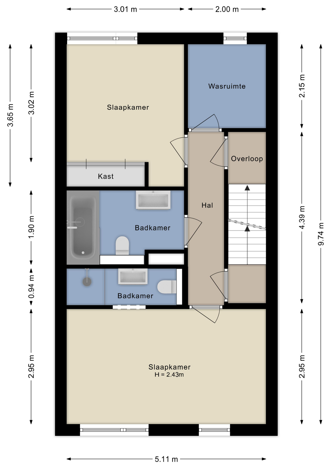 • 2 badkamers + wasruimte