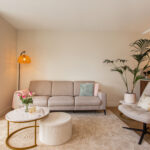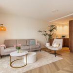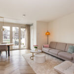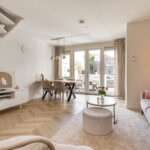 De lichte woonkamer is strak afgewerkt en voorzien van een moderne PVC-vloer met vloerverwarming en een gestukt plafond met inbouwspots (keuken). Aan de voorzijde zorgen dubbele openslaande deuren voor een mooie verbinding met de veranda, waardoor binnen en buiten naadloos in elkaar overlopen.