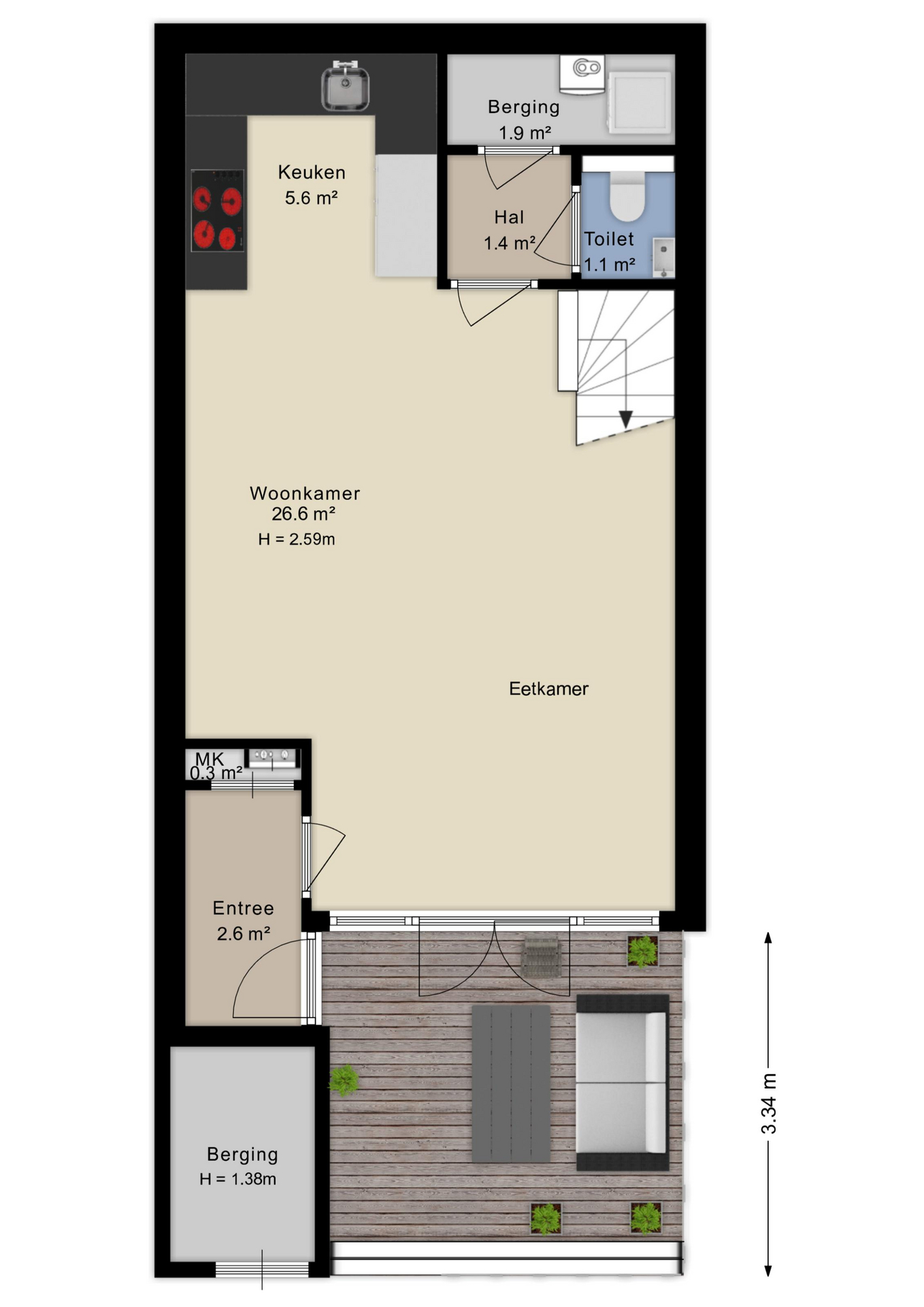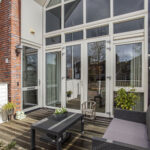 De onderhoudsvriendelijke voortuin/veranda ligt op het zonnige westen en is een heerlijke plek om tot in de avond van de zon te genieten. De verhoogde vlonder, het hekwerk en de gedeeltelijke overkapping onder het puntdak zorgen voor een sfeervolle en beschutte buitenruimte. Naast de woning bevindt zich een praktische buitenberging.