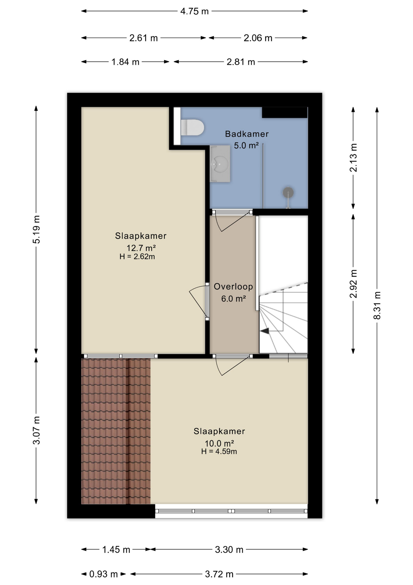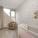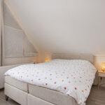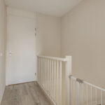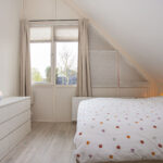 De overloop geeft toegang tot twee ruime slaapkamers, beide met een karakteristieke raampartij en nette afwerking. Eén van de kamers beschikt over extra bergruimte achter de knieschotten en toegang tot de vliering.