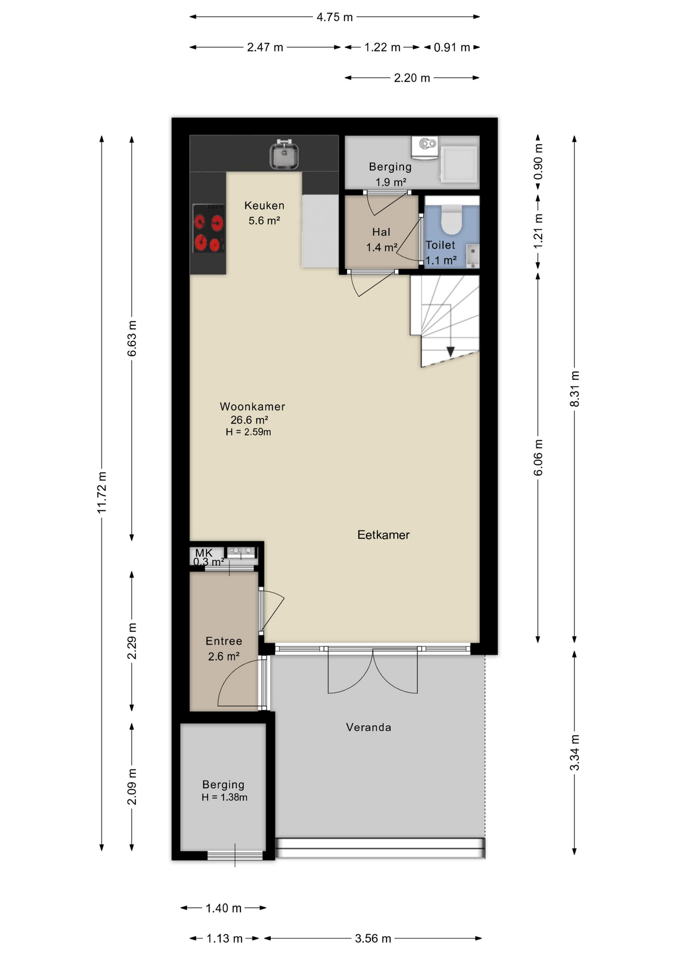 Via de zonnige veranda aan de voorzijde — gelegen op het westen — bereik je de entree van de woning. In de hal bevinden zich de meterkast en toegang tot de woonkamer.