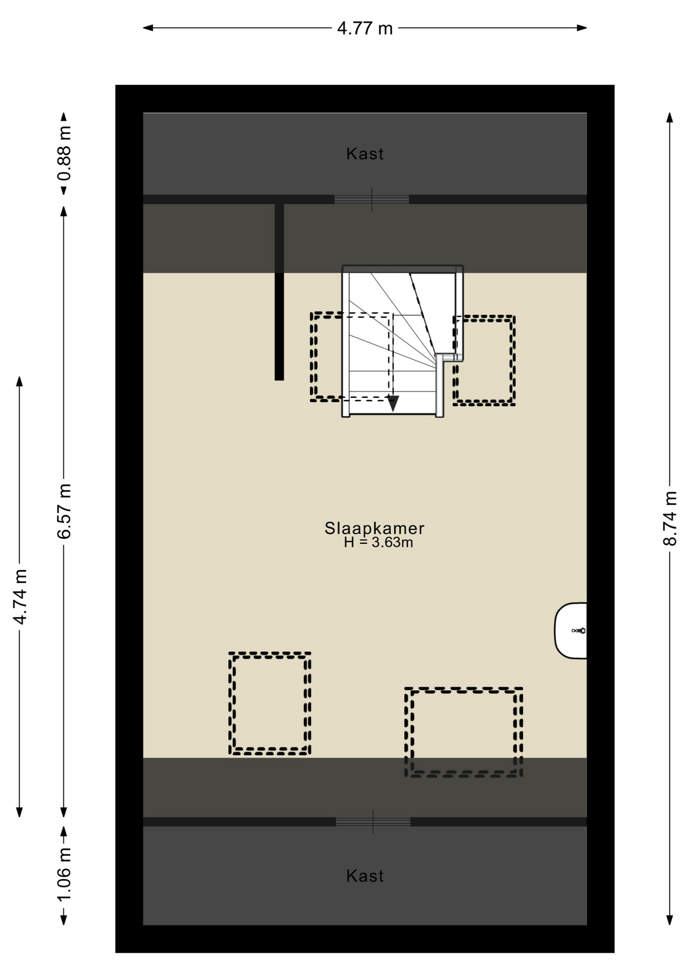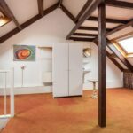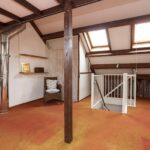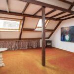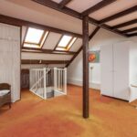 Een ruime slaapkamer met een wastafel en met dakramen aan zowel de voor als achterzijde, dit biedt flexibiliteit voor eventuele herindeling, bijvoorbeeld met het plaatsen van een dakkapel. Op deze verdieping is veel bergruimte.