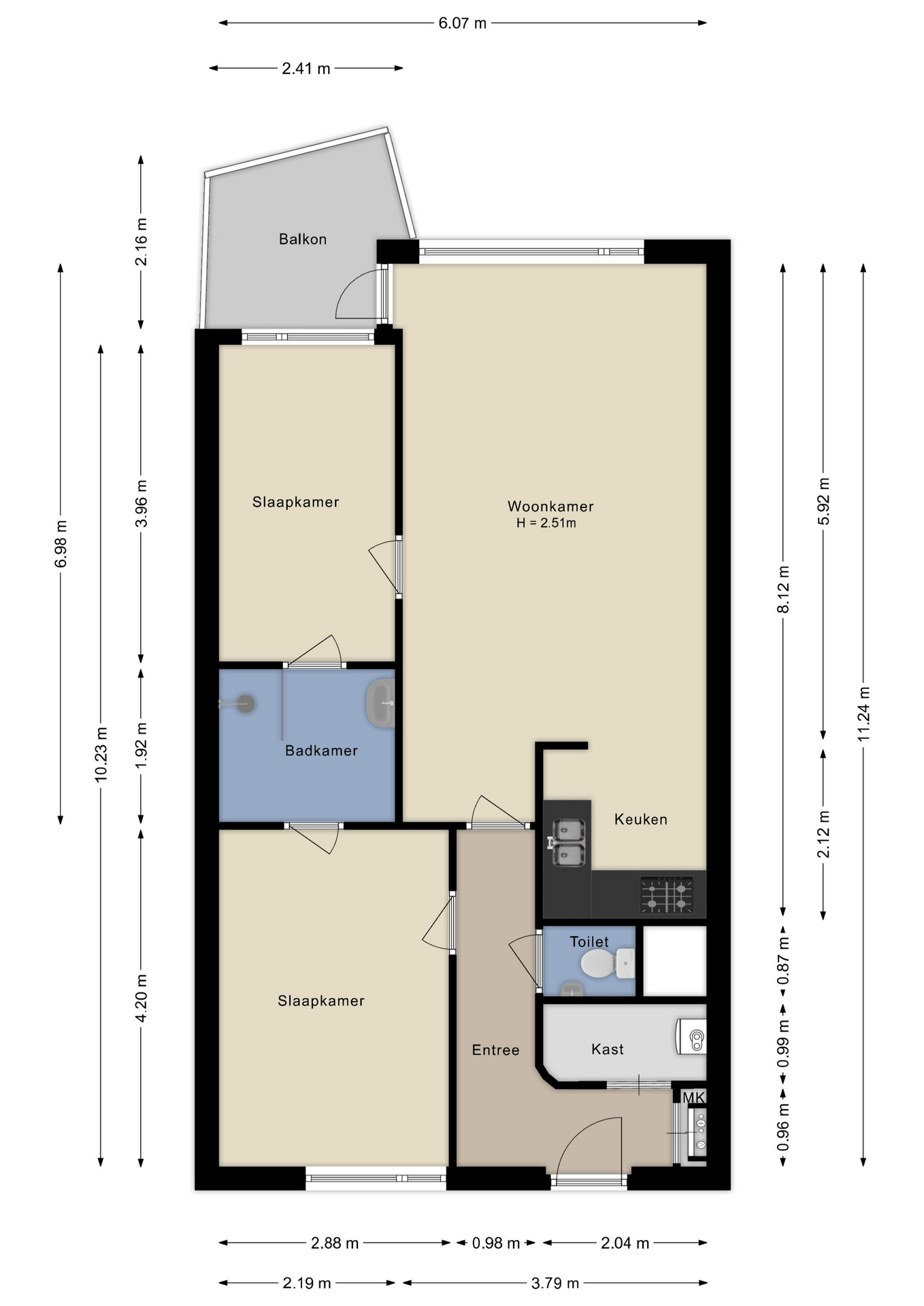 Bij binnenkomst kom je in de hal, van waaruit de interne berging, het toilet, de eerste slaapkamer en de woonkamer toegankelijk zijn. De ruime berging biedt plaats aan de cv-ketel en mechanische ventilatie box. De badkamer is uitgerust met een inloopdouche, wastafel, designradiator en aansluiting voor de wasmachine. Vanuit de badkamer is tevens de tweede slaapkamer bereikbaar. De slaapkamer aan de voorzijde is circa 12 m² groot, de tweede slaapkamer circa 10 m². De lichte woonkamer biedt voldoende ruimte voor een gezellige zithoek en eethoek, en grenst aan de open keuken met 4-pits gaskookplaat, oven en afzuigkap. Vanuit de woonkamer heb je toegang tot het zonnige balkon op het zuidoosten – een heerlijke plek om te ontspannen.