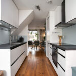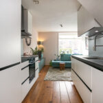 De open keuken, die aan beide zijden is opgesteld en voorzien van diverse inbouwapparatuur, waaronder een koel-/vriescombinatie, vaatwasser, combimagnetron, kookplaat en afzuigkap. Aan de voorzijde van de woonkamer is nog een prettige zithoek gecreëerd.