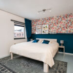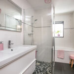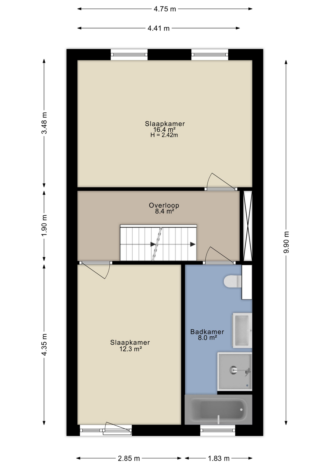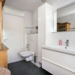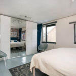 Aan de voorzijde bevindt zich een slaapkamer met Frans balkon en de badkamer, welke is voorzien van een ligbad, inloopdouche, vaste wastafel met badkamermeubel en een 2de toilet. De royale ouderslaapkamer ligt aan de achterzijde en beslaat de volledige breedte van de woning. Deze kamer is eventueel nog eenvoudig op te splitsen in twee slaapkamers.
