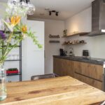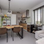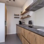 In de woonkamer is eveneens de keuken gesitueerd. Deze beschikt over een lang aanrechtblad, inductiekookplaat met afzuigkap, combi-oven en koelkast en voldoende opbergmogelijkheden.