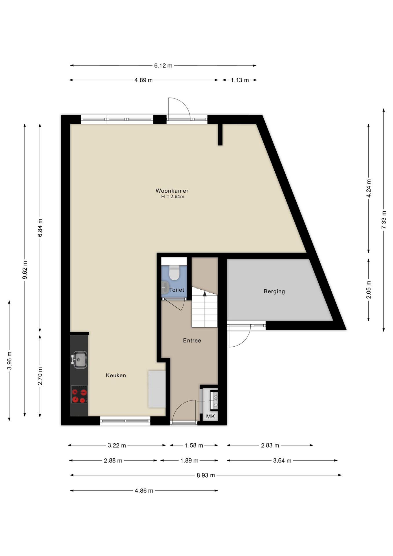 De hal/entree biedt toegang tot de ruime woonkamer, het toilet en de meterkast. De woonkamer is ca. 38 m² groot en voorzien van een trapkast. Aansluitend bevindt zich de moderne inbouwkeuken, die is voorzien van diverse inbouwapparatuur. Aansluitend bevindt zich de royale achtertuin op het noordwesten, gelegen aan het water.