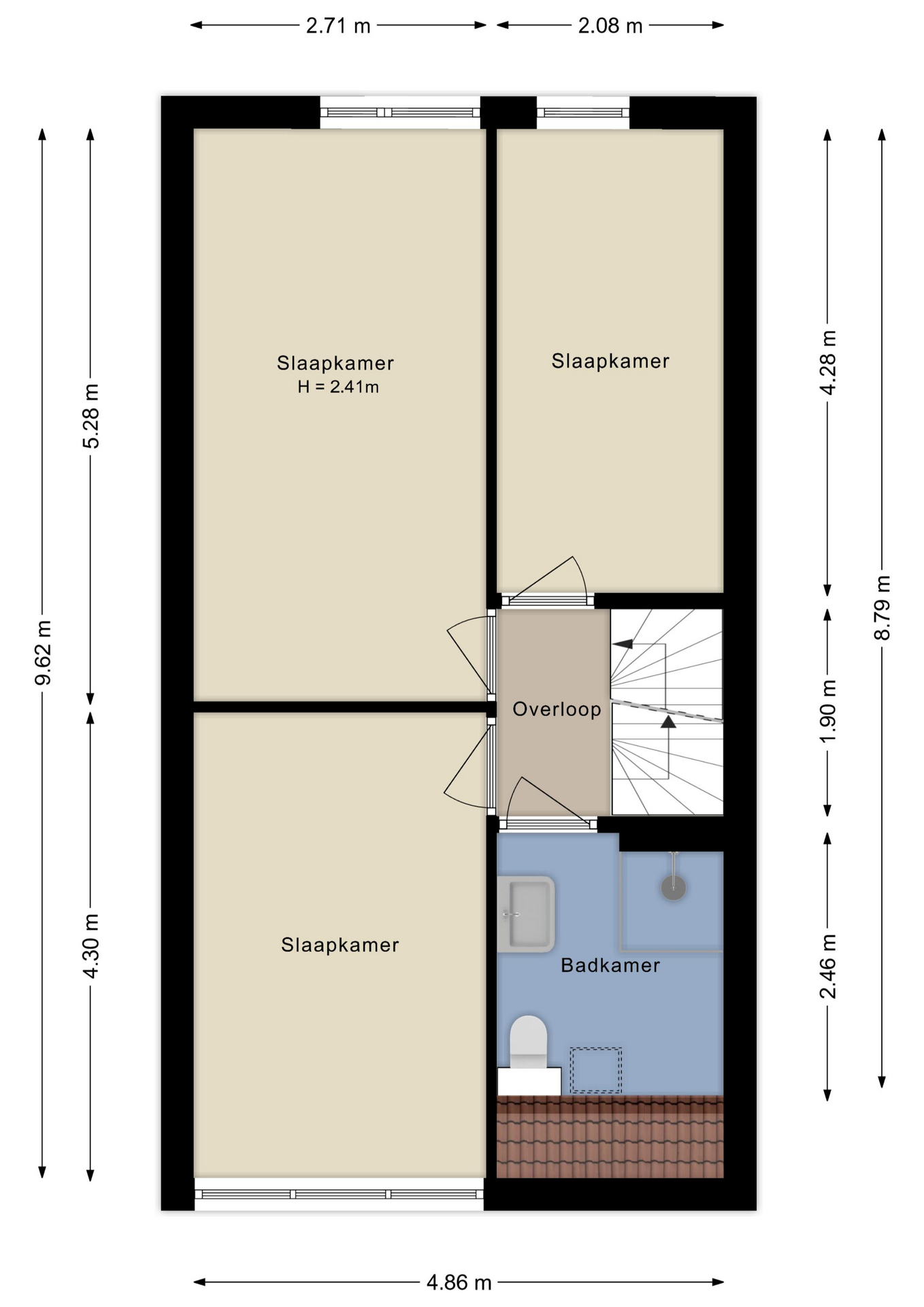 De overloop biedt toegang tot een drietal goed bemeten slaapkamers, alsmede de badkamer met inloopdouche, toilet en wastafel.
