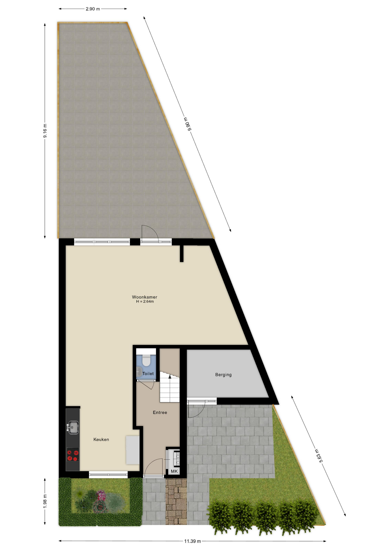 De voortuin is eveneens netjes ingericht en biedt toegang tot de stenen berging.