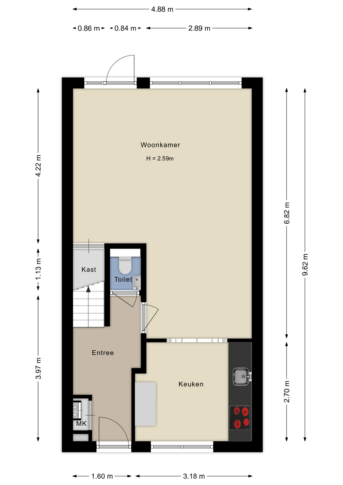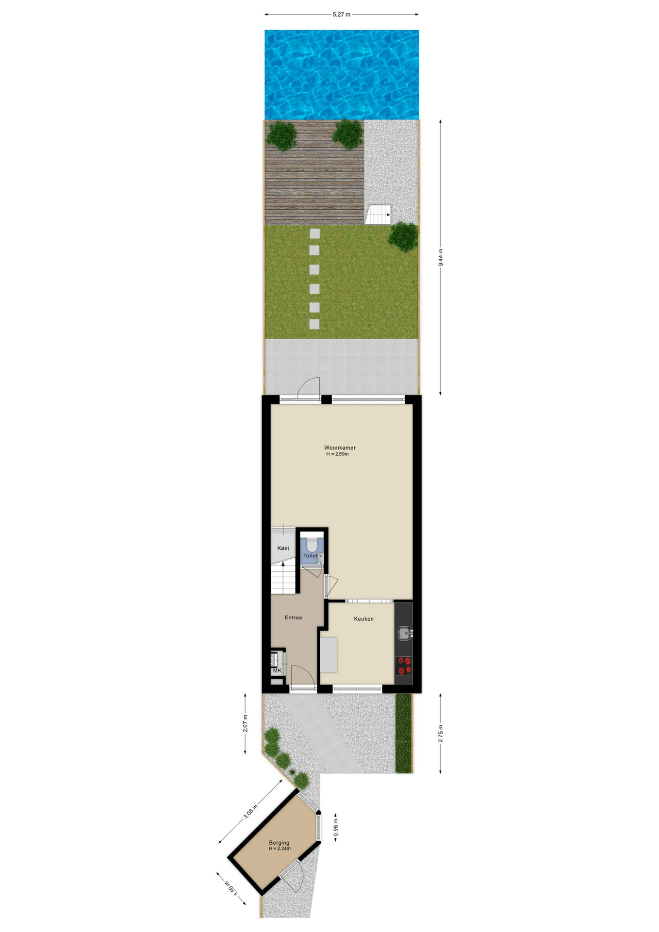 De hal/entree biedt toegang tot de ruime woonkamer, het toilet en de meterkast. De woonkamer is ca. 30 m² groot en voorzien van een trapkast. Aansluitend bevindt zich de moderne inbouwkeuken, die is voorzien van diverse inbouwapparatuur. Aansluitend bevindt zich de royale achtertuin op het noordoosten, gelegen aan het water.