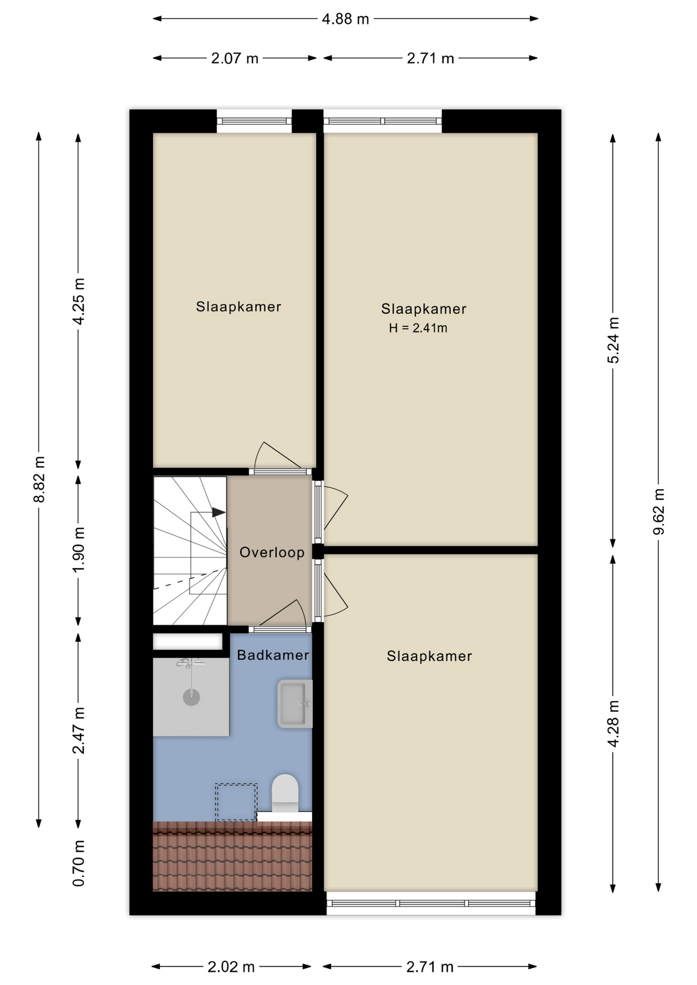 De overloop biedt toegang tot een drietal goed bemeten slaapkamers, alsmede de badkamer met inloopdouche, toilet en wastafel.