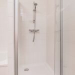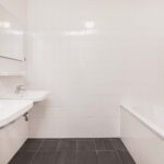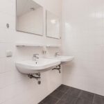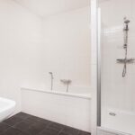 De badkamer is modern uitgevoerd, volledig betegeld en voorzien van een ligbad met thermostaatkraan, een douchecabine met thermostaatkraan alsmede twee wastafels en designradiator.