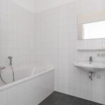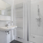 De badkamer is modern uitgevoerd, volledig betegeld en voorzien van een ligbad met thermostaatkraan, een douchecabine met thermostaatkraan alsmede een wastafel en designradiator.