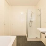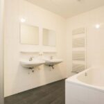 De grote badkamer is modern uitgevoerd, volledig betegeld en zowel voorzien van een ligbad met thermostaatkraan, een douchecabine met thermostaatkraan alsmede twee wastafels en designradiator.