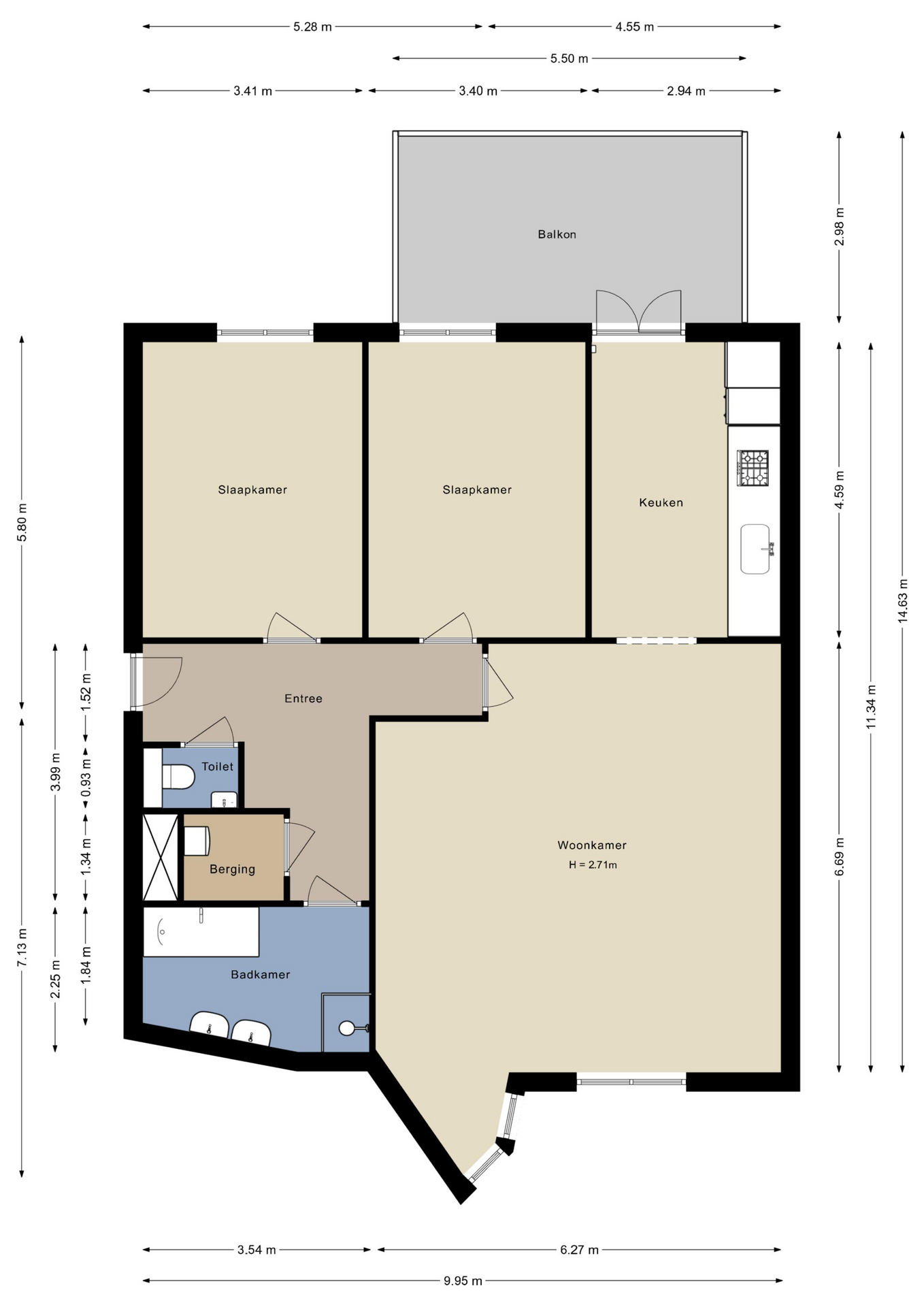 Het appartement beschikt over twee grote slaapkamers beide van circa 16 m2.