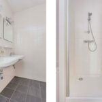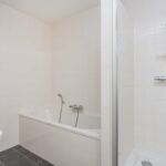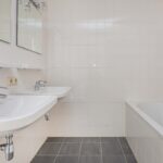 De grote badkamer is modern uitgevoerd, volledig betegeld en voorzien van een ligbad met thermostaatkraan, een douchecabine met thermostaatkraan alsmede twee wastafels en designradiator.