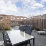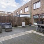 Via de openslaande deuren is de royale achtertuin van 58 m2 te bereiken. Deze is volledig betegeld en beschikt over een stenen berging, alsmede een achterom.