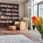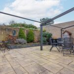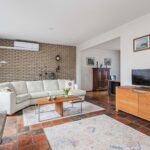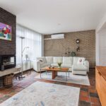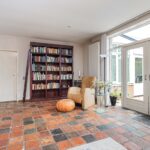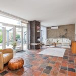 Via de overdekte entree kom je in de ruime hal met parketvloer, meterkast en toilet met fontein. De tuingerichte woonkamer is licht en sfeervol, voorzien van een plavuizenvloer, gashaard, karaktervol (deels schoon) metselwerk en stucwerk. Openslaande deuren geven toegang tot de zonnige, ommuurde patio. Dankzij de elektrische overkapping geniet je hier zowel van zon als schaduw.