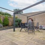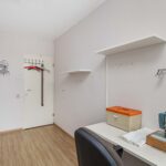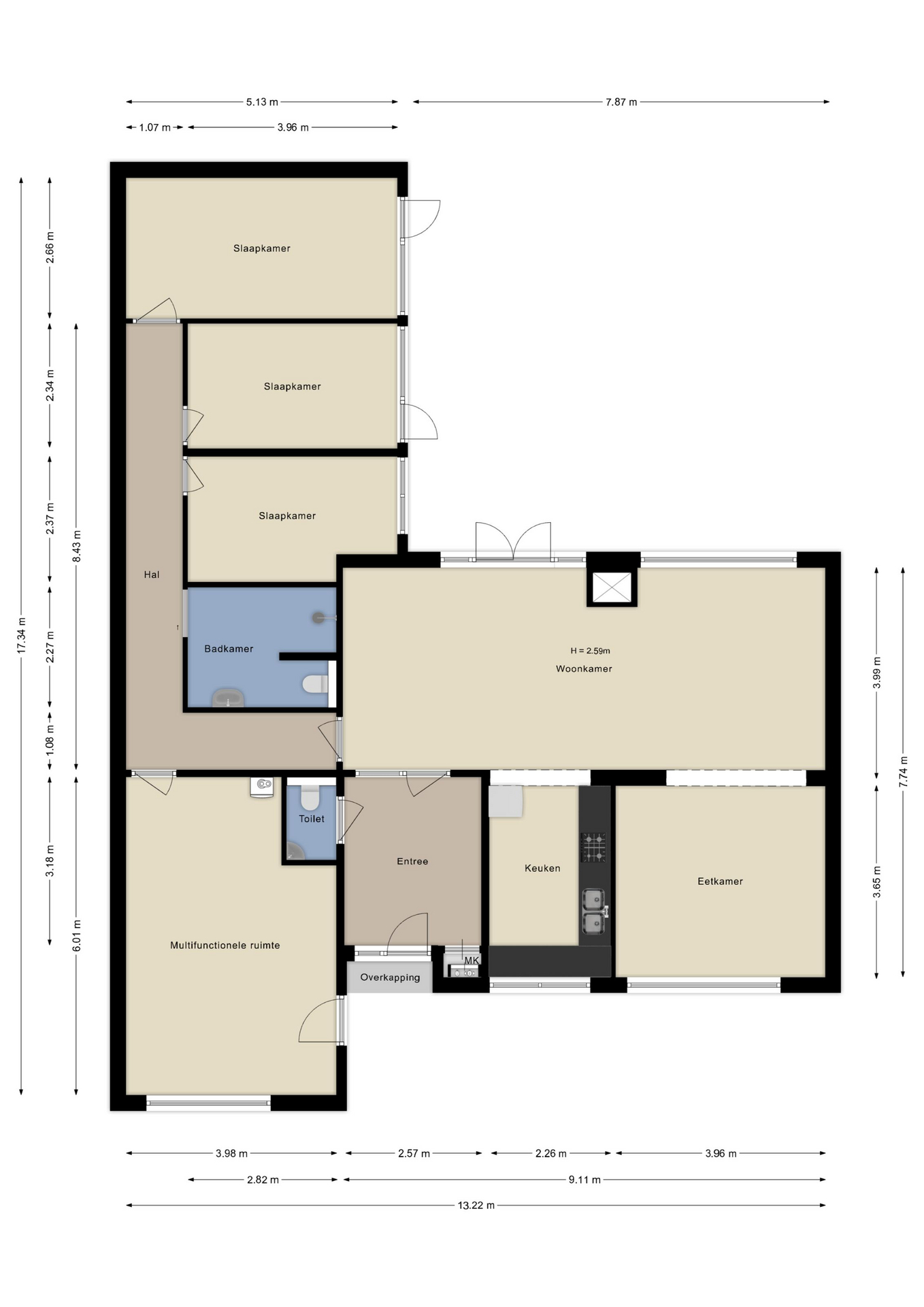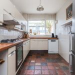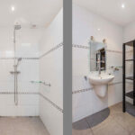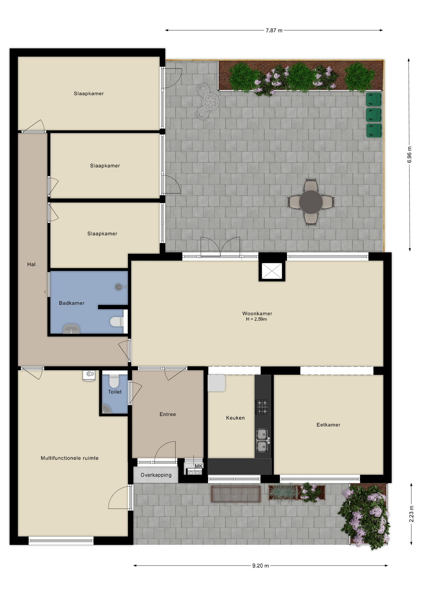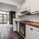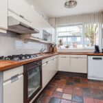 Aansluitend bevindt zich de eetkamer en de open keuken, uitgerust met plavuizen en diverse inbouwapparatuur. Via een L-vormige gang bereik je een multifunctionele kamer met opstelling van de cv-ketel en een directe toegang tot de voortuin. Verder beschikt de woning over een moderne badkamer met brede inloopdouche, toilet en wastafel, en drie comfortabele slaapkamers, waarvan twee met toegang tot de patio. Alle slaapkamers zijn voorzien van een laminaatvloer.