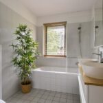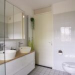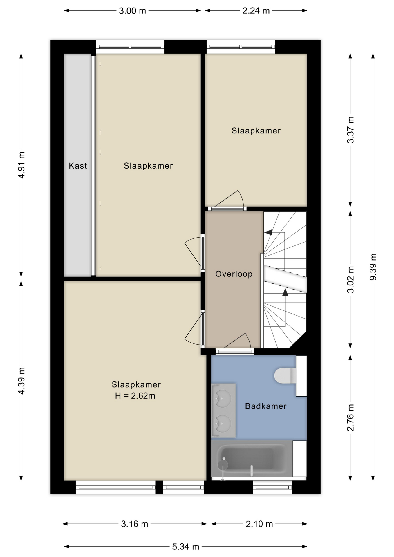 De trap in de woonkamer leidt je naar de overloop, waar je drie fijne slaapkamers en een badkamer aantreft. De grootste slaapkamer bevindt zich aan de voorkant van het huis, terwijl de twee andere slaapkamers aan de achterzijde liggen. De badkamer heeft een frisse uitstraling met lichtgrijze tegels en is voorzien van een extra groot bad met douche in één, een dubbele wastafel en een tweede toilet.