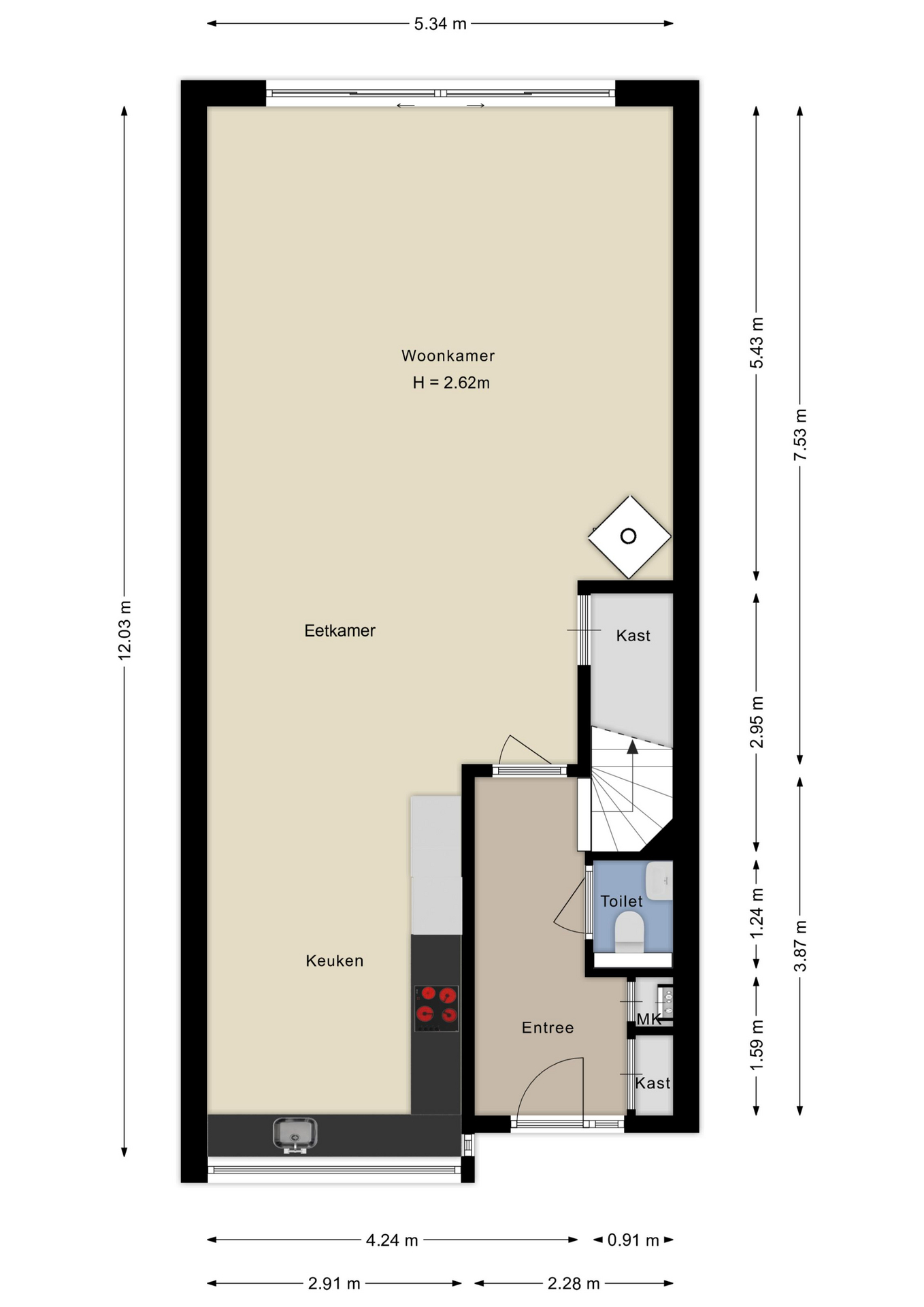 Via de hal met toilet en fonteintje loop je zo de royale en lichte woonkamer in. Deze is dankzij de uitbouw van twee meter écht ruimtelijk en voorzien van een brede schuifpui, waarmee je binnen en buiten naadloos met elkaar verbindt. Aan de voorkant van de woning bevindt zich de keuken in een gezellige erker. De keuken is compleet uitgerust met een vaatwasser, koelkast, combimagnetron, vriezer, keramische kookplaat en afzuigkap. Ook is de keuken voorzien van een granieten werkblad. Gezellig koken is hier gegarandeerd! En wil je knusheid? Stook dan de houtkachel lekker op in de woonkamer. Ook is er extra bergruimte in de trapkast. De begane grond is voorzien van een pvc vloer met vloerverwarming.