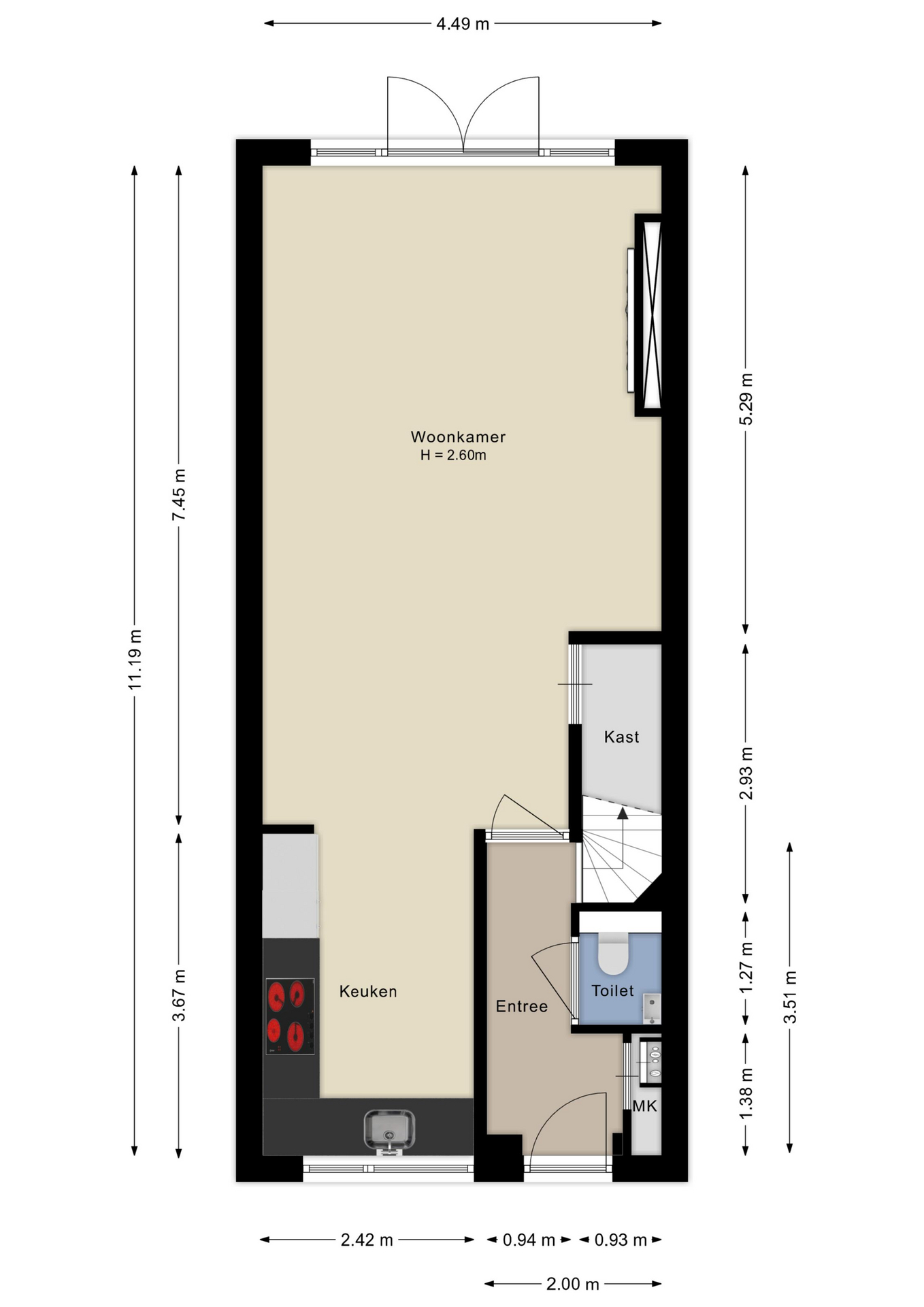Op de begane grond kom je binnen in de hal met toegang tot het moderne toilet en de trap naar boven. Vanuit de hal bereik je de lichte woonkamer en open keuken. De keuken, aan de voorzijde van de woning, is voorzien van moderne inbouwapparatuur. De woonkamer aan de achterzijde heeft een grote raampartij en openslaande deuren naar de tuin. De tuin is voorzien van een overkapping, houten berging en achterom.