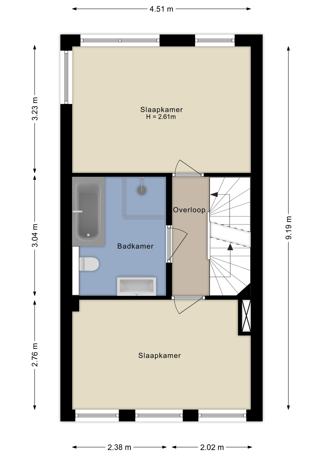 Op de eerste verdieping vind je twee slaapkamers en de badkamer. De grootste slaapkamer biedt plek voor een tweepersoonsbed en een grote kledingkast. De andere kamer is ideaal als kinder-, werk- of logeerkamer. De badkamer is modern afgewerkt met een inloopdouche, ligbad, verwarmde spiegel, wastafelmeubel en tweede toilet.