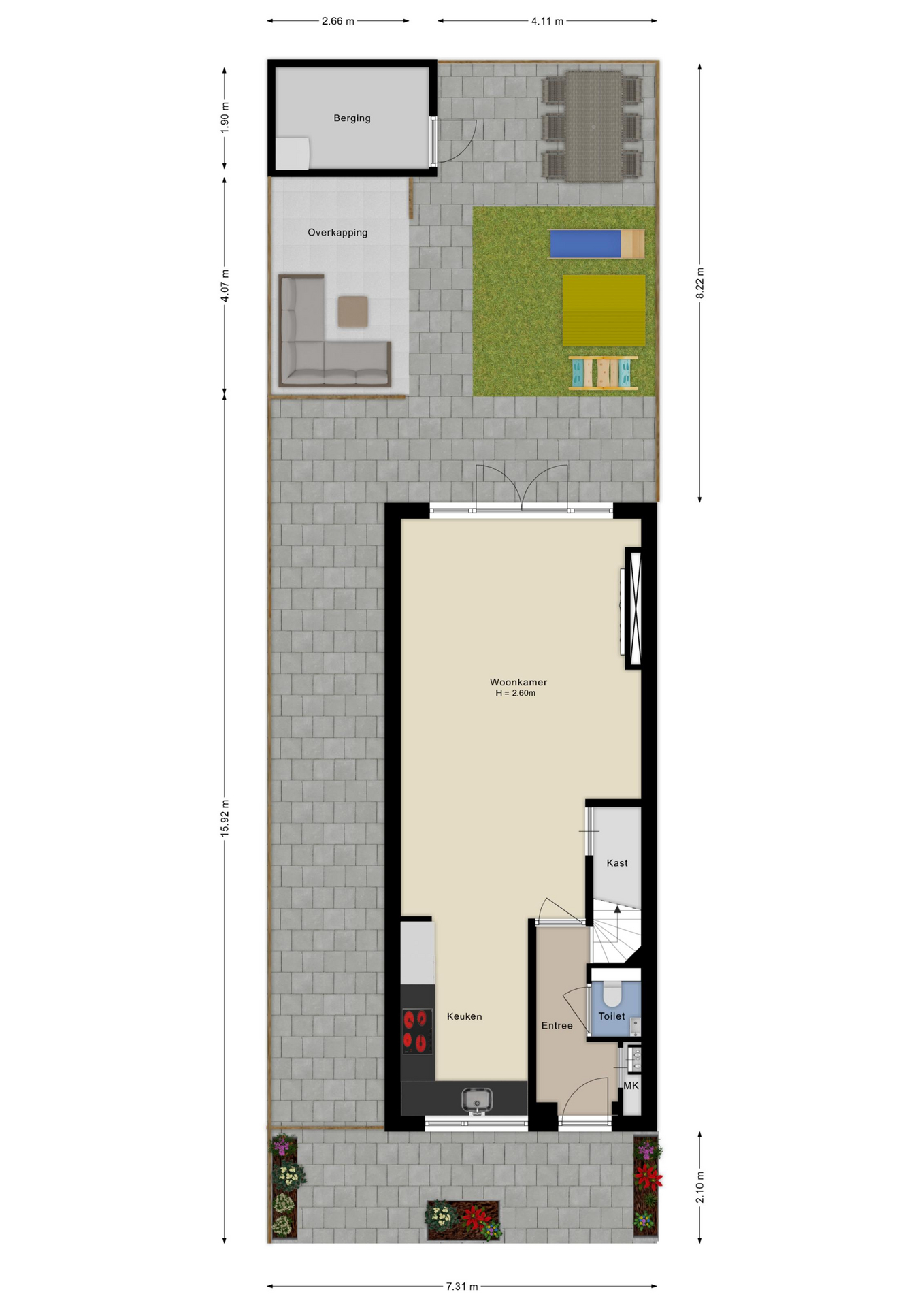 - Tuin op het noordoosten met overkapping.