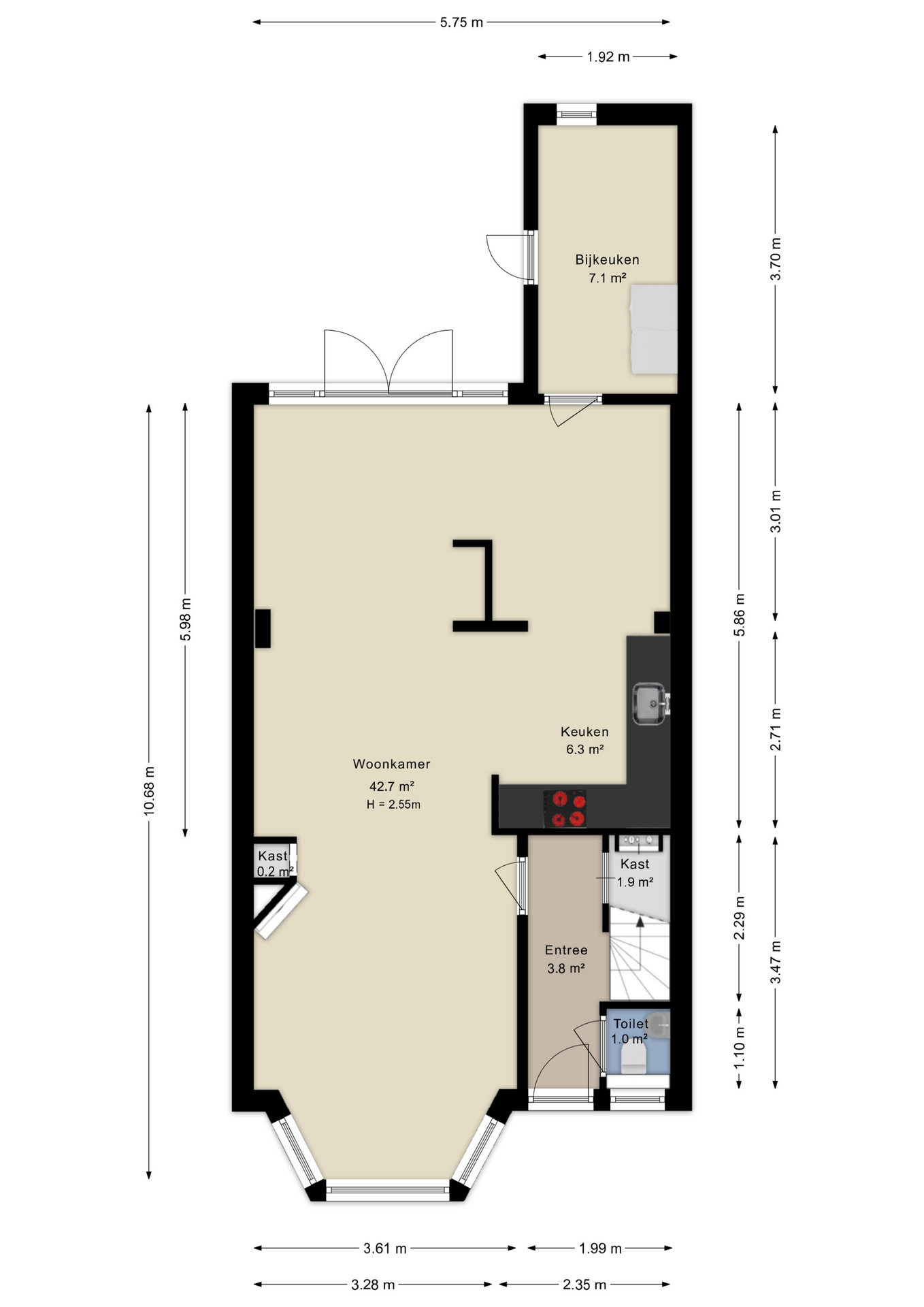 Via de voortuin kom je binnen in de hal met toilet, kelderkast en trapopgang. De begane grond voelt opvallend ruim en open. De aangebouwde erker aan de voorzijde zorgt voor extra ruimte en een prachtige lichtinval gedurende de dag.
