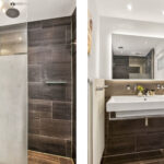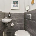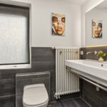 De badkamer is strak en eigentijds uitgevoerd en beschikt over: