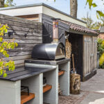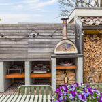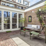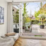 Via de hoge openslaande deuren stap je rechtstreeks de tuin in. Binnen en buiten lopen naadloos in elkaar over.