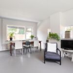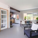 De woonkamer is ruim van afmeting en is eveneens voorzien van een marmoleumvloer en glad gestucte wanden/plafond. Deze doorzonkamer is zéér licht door de vele raampartijen.