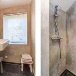 Modern afgewerkte badkamer aan de voorzijde van de woning voorzien van inloopdouche met thermostaatkraan, wastafel en mechanische ventilatie.