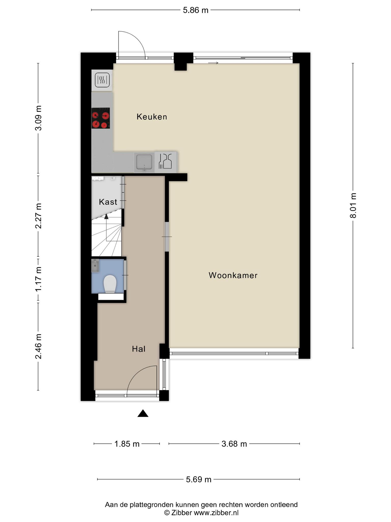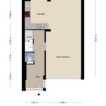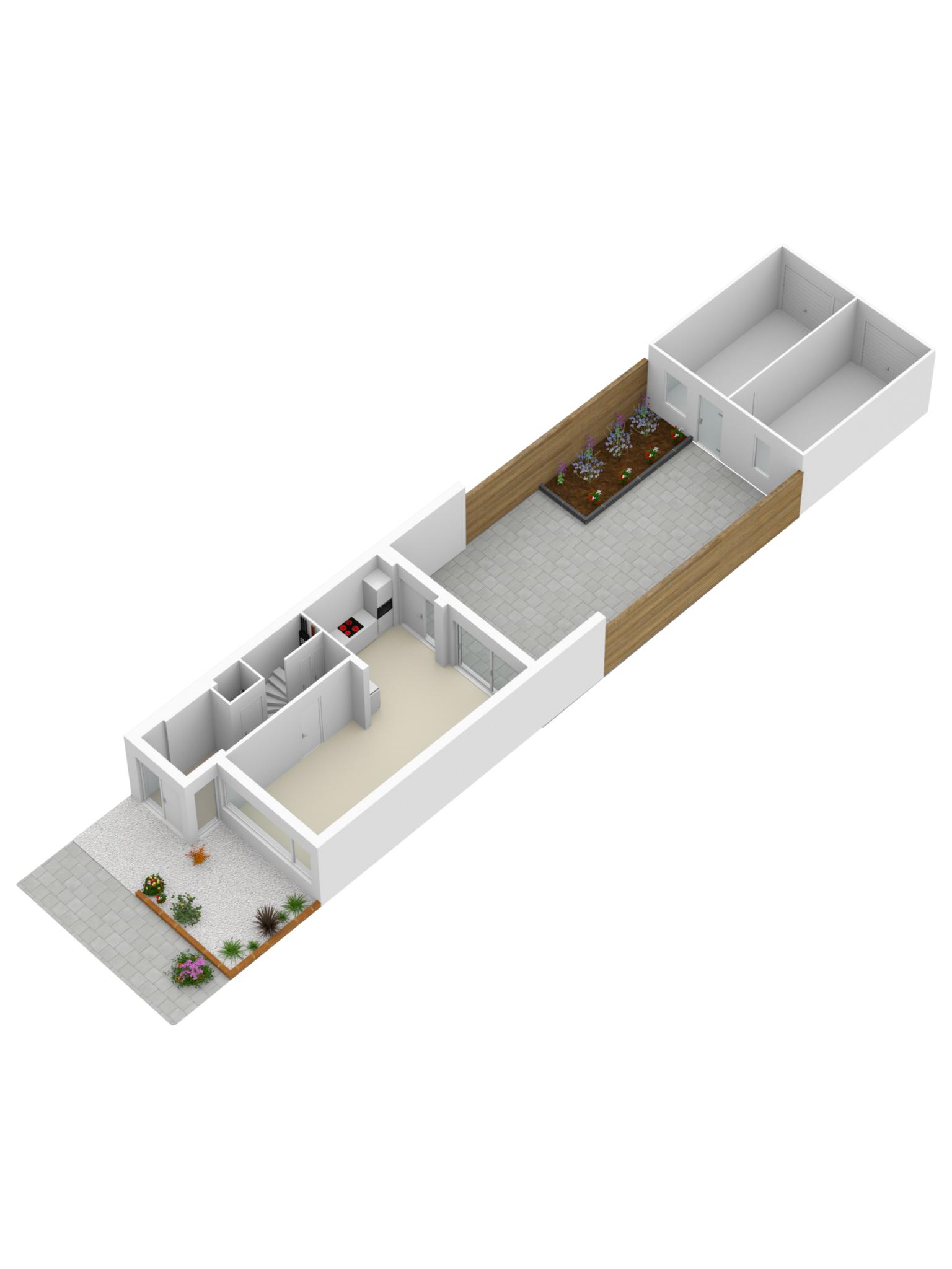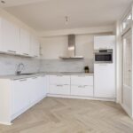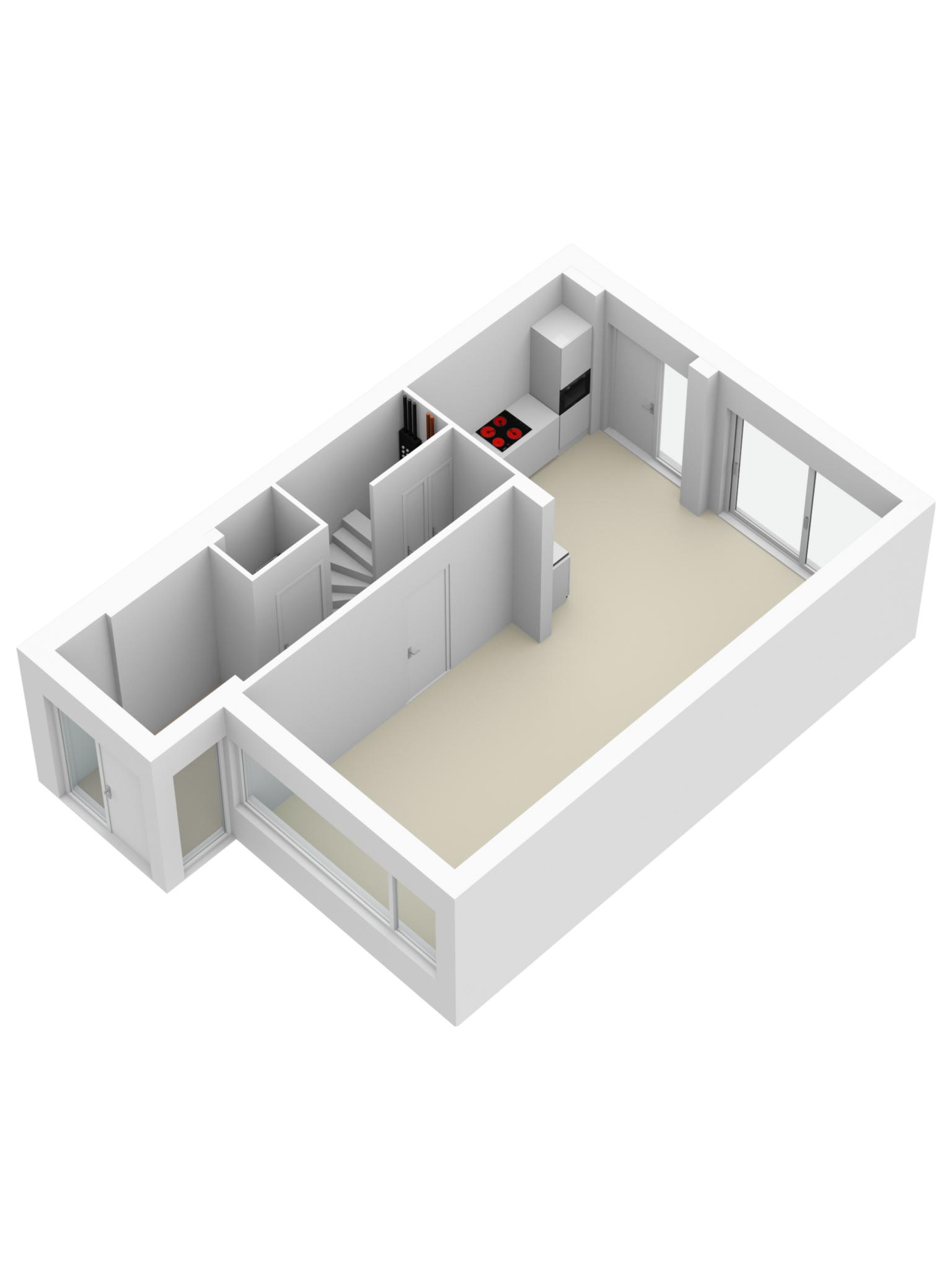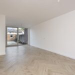Begane grond: Voortuin, ruime hal, toiletruimte met hangend toilet, fontein en gedeeltelijk betegeld, provisie-/meterkast (vernieuwd en voorzien van 9 groepen + 3 aardlekschakelaar) onder de trap naar eerste etage, doorzonkamer met PVC visgraatvloer en vloerverwarming. Schuifpui naar de tuin. Lichte L-vormige keuken voorzien van afzuigkap, vaatwasser, inductiekookplaat, combioven en koelkast.