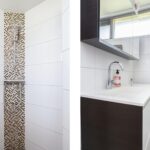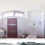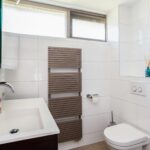 Overloop, moderne badkamer met douche, toilet en wastafel in meubel, drie slaapkamers en trapopgang.