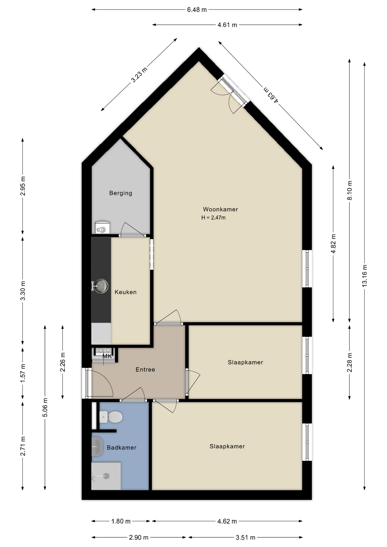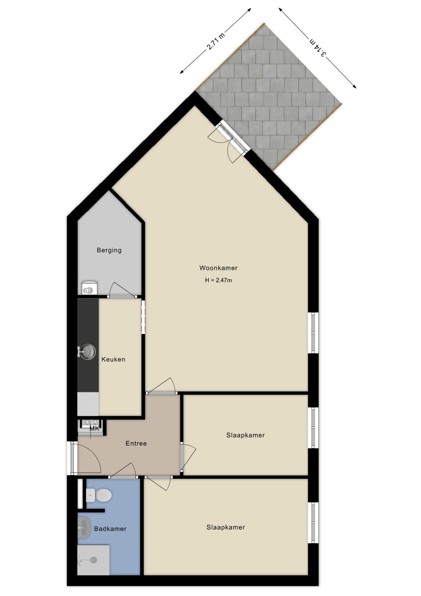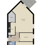 Vanuit de centrale hal bereik je het appartement. Bij binnenkomst kom je in een hal/entree. Vanuit de hal zijn de badkamer, de woonkamer én de twee slaapkamers bereikbaar. De badkamer beschikt over een douche, wastafel en toilet. De half open keuken, bereikbaar vanuit de woonkamer, is basic afgewerkt. Naast de keuken is de berging / technische ruimte gelegen. Hier bevinden zich o.a. de CV ketel en de wasmachine aansluiting.
