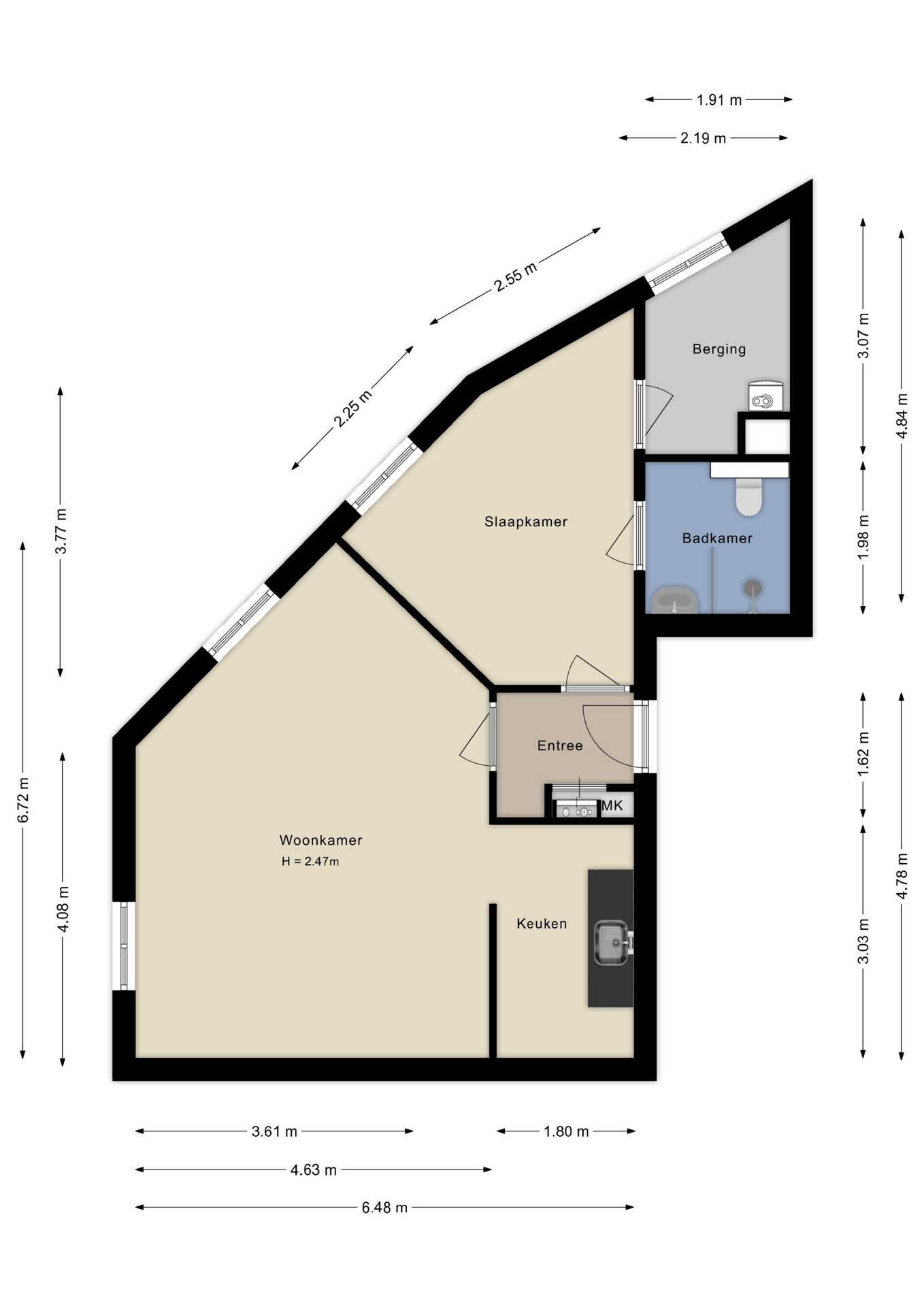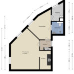 Vanuit de centrale hal bereik je via de trap of de lift de tweede verdieping. Via een lange gang bereik je het appartement. Bij binnenkomst kom je in een hal/entree. Vanuit de hal zijn de woonkamer én de slaapkamer bereikbaar. Via de slaapkamer heb je toegang tot de badkamer en de berging / technische ruimte (CV ketel en wasmachine aansluiting). De badkamer beschikt over een douche, wastafel en toilet. De hal open keuken, bereikbaar vanuit de woonkamer, is basis afgewerkt.
